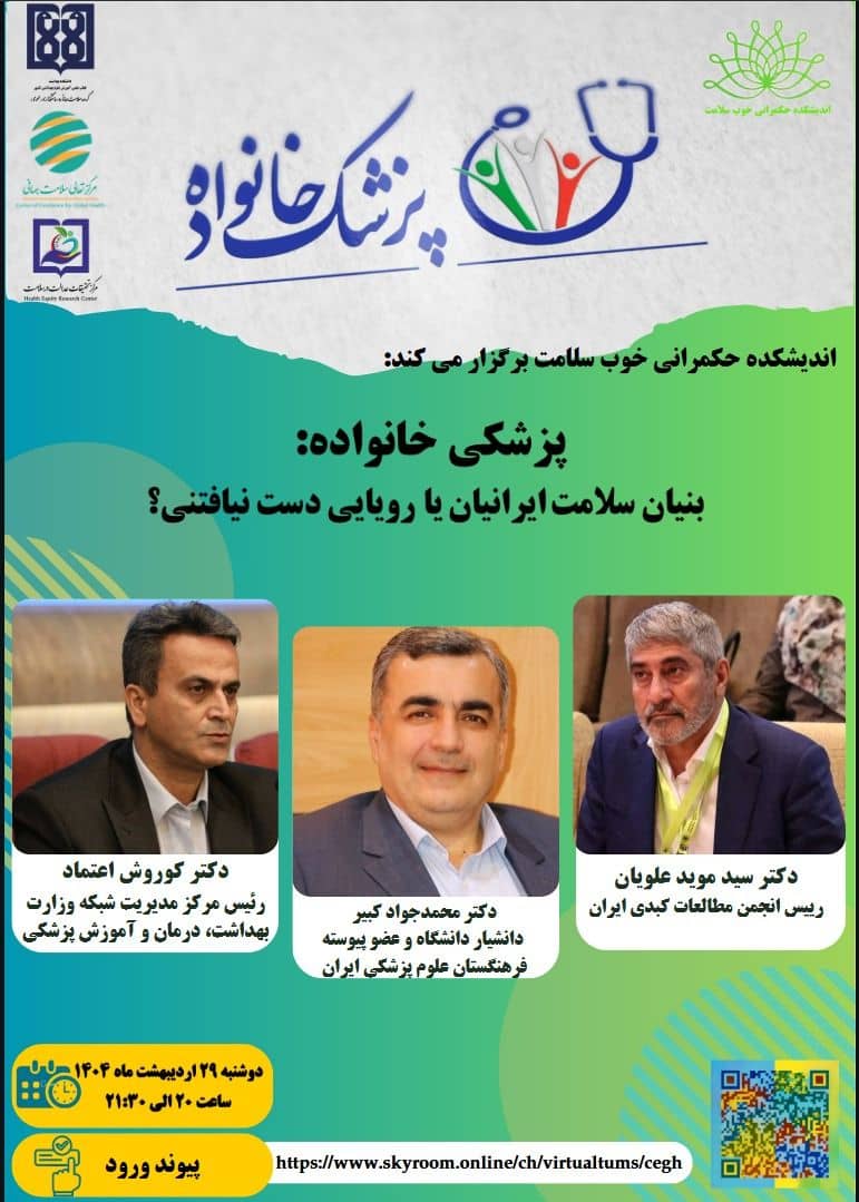 نشست مجازی با موضوع «پزشکی خانواده: بنیان سلامت ایرانیان یا رویایی دستنیافتنی؟» با حضور صاحبنظران حوزه سلامت کشور، روز دوشنبه ۲۹ اردیبهشت ۱۴۰۴ از ساعت ۲۰ تا ۲۱:۳۰ برگزار خواهد شد.