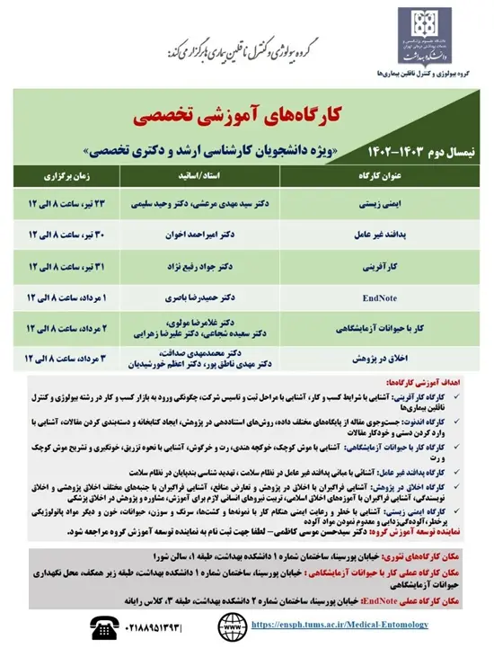 گروه بیولوژی و کنترل ناقلین بیماری ها کارگاه های تابستان گروه بیولوژی و کنترل ناقلین بیماری ها کارگاه های آموزشی فصل تابستان در گروه بیولوژی و کنترل ناقلین بیماری ها به شرح جدول پیوست برای استفاده علاقمندان اعلام می گردد. کد خبر : 270956 کپی کلمات کلیدی کارگاه آموزشیکارگاه_گروه_بیولوژی_و_کنترل_ناقلین_بیماری_ها