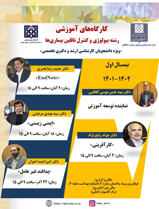 کارگاه های آموزشی برای دانشجویان کارشناسی ارشد و دکترای تخصصی گروه حشره شناسی پزشکی مطابق جدول زیر برگزار خواهد شد. جهت ثبت نام و اطلاعات بیشتر با مسئول توسعه آموزش گروه حشره شناسی پزشکی و مبارزه با ناقلین تماس حاصل نمایید.