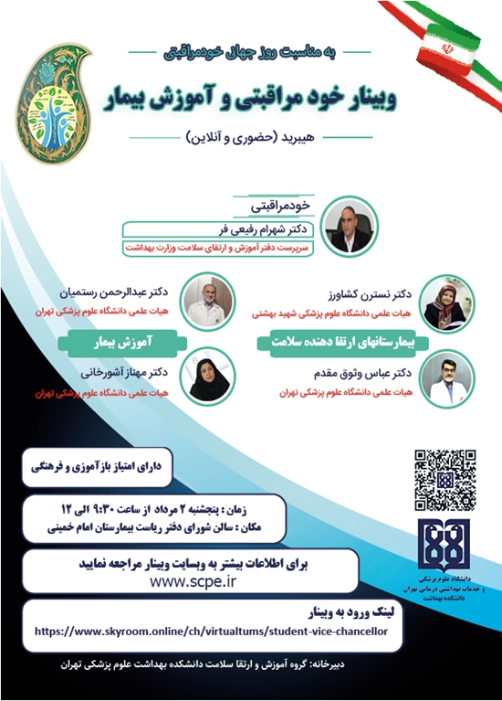 به مناسبت روز جهانی خودمراقبتی، وبیناری با عنوان «خودمراقبتی و آموزش بیمار» روز پنجشنبه ۲ مردادماه ۱۴۰۴ به صورت هیبرید (حضوری و مجازی) برگزار میشود.
