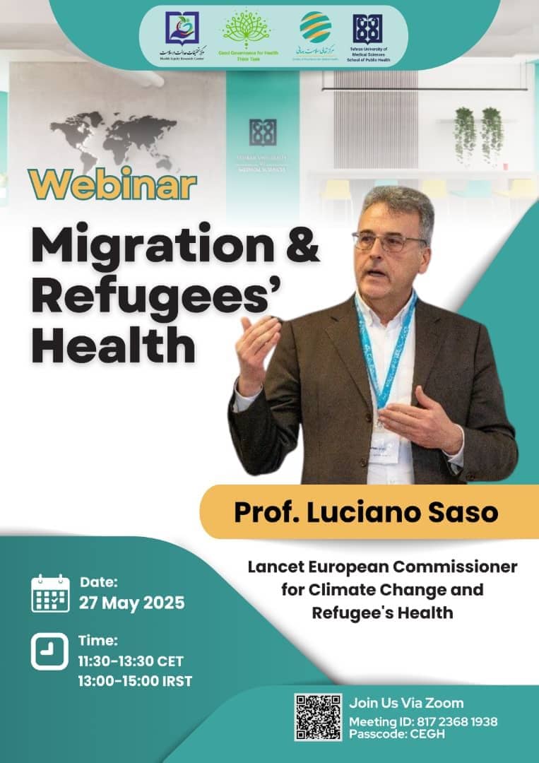 مرکز تعالی سلامت جهانی در ادامه برنامههای علمی خود، وبیناری با موضوع «مهاجرت و سلامت پناهندگان» با حضور پروفسور لوسیانو ساسو، کمیسر اروپایی مجله Lancet، روز سهشنبه ۶ خرداد ۱۴۰۴ از ساعت ۱۳ تا ۱۵ برگزار میکند.