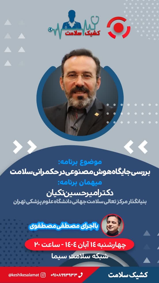 پخش برنامه «کشیک سلامت» با حضور دکتر امیرحسین تکیان امشب، چهارشنبه ۱۴ آبان ۱۴۰۴، ساعت ۲۰ از شبکه سلامت سیما در این برنامه، دکتر امیرحسین تکیان، بنیان‌گذار مرکز تعالی سلامت جهانی دانشگاه علوم پزشکی تهران، درباره جایگاه هوش مصنوعی در حکمرانی سلامت سخن خواهد گفت و به بررسی نقش فناوری‌های نوین در سیاستگذاری و ارتقای نظام سلامت کشور می‌پردازد.