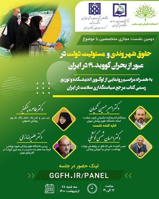 این نشست مشترک به همت گروه سلامت جهانی و سیاستگذاری عمومی دانشکده بهداشت، مرکز تحقیقات عدالت در سلامت و اندیشکده حکمرانی خوب سلامت و با حضور دکتر امیرحسین تکیان مدیر گروه سلامت جهانی و سیاستگذاری عمومی و استاد دانشگاه علوم پزشکی تهران، دکتر احسان شمسی گوشکی دبیر کمیته ملی اخلاق در پژوهش وزارت بهداشت، درمان و آموزش پزشکی، دکتر طاهره چنگیز رئیس دانشگاه علوم پزشکی اصفهان و دکتر علیرضا زالی رئیس دانشگاه علوم پزشکی شهید بهشتی و فرمانده عملیات مدیریت بیماری کرونا در کلانشهر تهران برگزار شد.