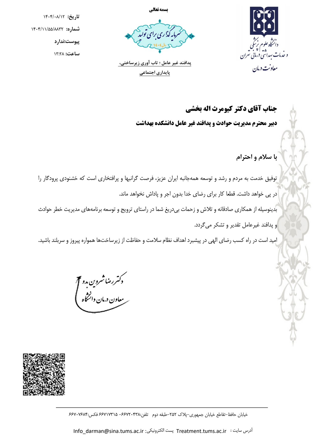 «بدین‌وسیله از همکاری صادقانه و تلاش و زحمات بی‌دریغ شما در راستای ترویج و توسعه برنامه‌های مدیریت خطر حوادث و پدافند غیرعامل تقدیر و تشکر می‌گردد.»