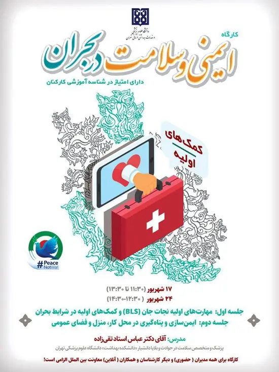 به گزارش روابط عمومی معاونت بین‌الملل دانشگاه علوم پزشکی تهران، اولین دوره از مجموعه کارگاه مهارت‌های اولیه در شرایط بحران باهدف ارتقای آمادگی کارکنان این معاونت در مواجهه با شرایط بحرانی، با مدیریت کارگروه آموزش و اطلاع رسانی و تولید رسانه در شرایط بحران، در دو تاریخ 17 و 24 شهریور با تدریس آقای دکتر عباس استاد تقی‌زاده پزشک و متخصص سلامت در حوادث و فوریت‌ها و دانشیار دانشکده بهداشت دانشگاه علوم پزشکی تهران، و آقای دکتر احمد کاملی، عضو هیات علمی دانشگاه علوم پزشکی خراسان شمالی، برگزار می‌شود.