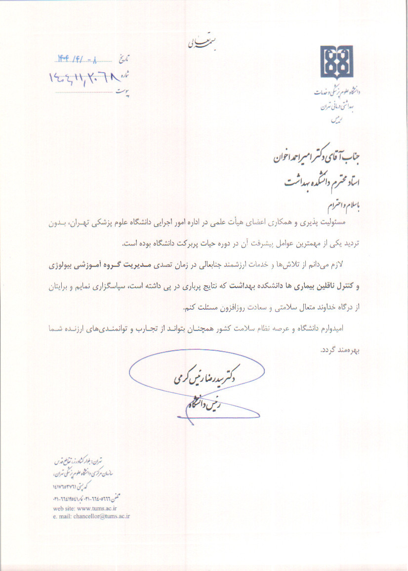 همچنین در حکم جداگانه‌ای، از تلاش‌ها و خدمات ارزنده دکتر امیر احمداخوان در مدت تصدی مدیریت گروه آموزشی بیولوژی و ایفای نقش مؤثر در پیشبرد اهداف آموزشی، پژوهشی و اجرایی این گروه در دانشکده بهداشت، تقدیر و تشکر شده است.