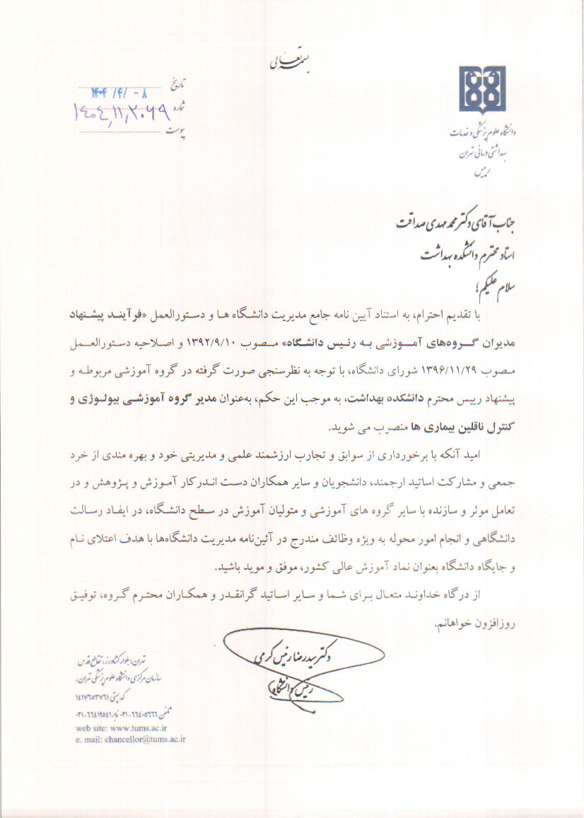 در حکمی از سوی رئیس دانشگاه علوم پزشکی تهران، دکتر محمدمهدی صداقت به عنوان مدیر گروه آموزشی بیولوژی و کنترل ناقلین بیماری های دانشکده بهداشت منصوب شد. همچنین از خدمات دکتر امیر احمداخوان در دوران تصدی این مسئولیت قدردانی به عمل آمد.