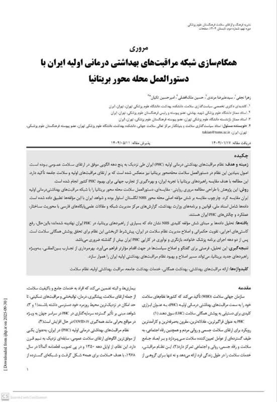 این مطالعه، شش مؤلفه کلیدی دستورعمل محلهمحور بریتانیا را با ساختار شبکه PHC ایران تطبیق داده و نشان داد که: