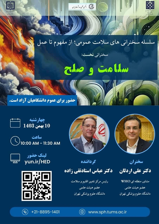 به گزارش سینا رسانه دانشگاه علوم پزشکی تهران به نقل از دانشکده بهداشت،نخستین جلسه از سلسله سخنرانیهای سلامت عمومی با عنوان «سلامت و صلح»، به همت دپارتمان سلامت در حوادث و بلایا دانشگاه علوم پزشکی تهران، مرکز تحقیقات تغییر اقلیم و سلامت پژوهشکده محیط زیست، و انجمن علمی بهداشت ایران برگزار شد. این سخنرانی با گردانندگی جناب دکتر عباس استاد تقیزاده و سخنرانی جناب دکتر علی اردلان، در تاریخ چهارشنبه 10 بهمن ماه، از ساعت 10 تا 11:30 صبح در محل دانشگاه برگزار گردید.در این جلسه، مباحث مرتبط با پیوند سلامت و صلح و تاثیرات آن بر جوامع به بحث و تبادل نظر گذاشته شد. جناب آقای دکتر علی اردلان با ارائه مطالب علمی و تجربی، به اهمیت توجه به سلامت در راستای تحقق صلح و امنیت در جوامع پرداخته و بر لزوم همکاریهای بینالمللی در راستای بهبود شرایط بهداشتی و رفاهی تاکید کردند.این جلسه، با استقبال گستردهای از سوی دانشجویان، استادان و فعالان حوزه سلامت همراه بود و فرصتی ارزشمند برای تبادل دیدگاهها و تجربیات در این زمینه فراهم کرد. همچنین، شرکتکنندگان در این رویداد موفق به دریافت گواهینامه از دانشکده بهداشت دانشگاه علوم پزشکی تهران شدند.دپارتمان سلامت در حوادث و بلایا دانشگاه علوم پزشکی تهران اعلام کرده است که این سلسله سخنرانیها به صورت ماهانه ادامه خواهد داشت و بهطور مستمر موضوعات مختلف مرتبط با سلامت عمومی و چالشهای آن در جوامع به بحث گذاشته خواهد شد.